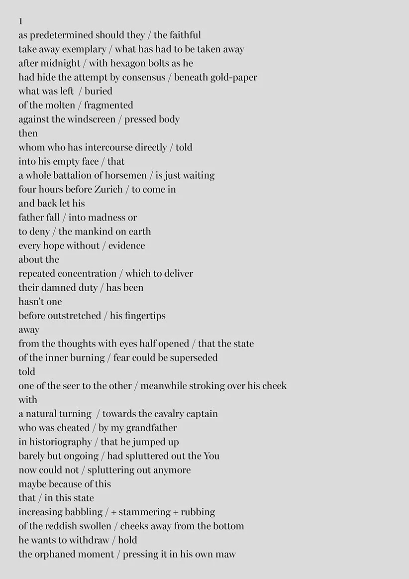 I used the format of this book to newly arrange the lineation. The size and the grid had an important influence on how the lines are connecting. You can read the lines in their vertical connection or as a lineation on the respective left or right page. So the combination of the words and short sentences and with it the secondary meaning depends on the formal conditions. This is the right point at which to explain the difference between the primary meaning and the secondary. In relation to the questions about contingency – about our understanding of what happens by accident that we can call random or define it as chance operation –, I hinted at before: The sense of our acting is primarily given by the elementary yearnings. This acting happens involuntarily and it flows through every so called deliberate action.